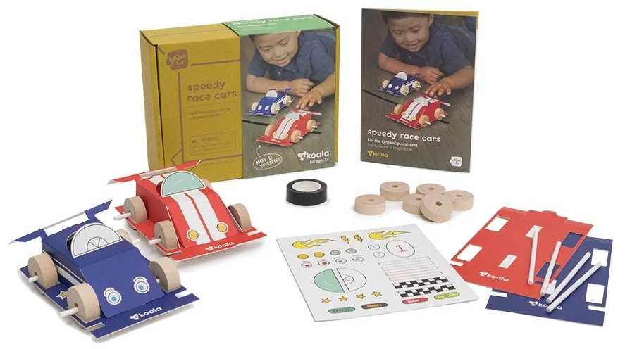 Kids construct the race cars by folding perforated tabs, slotting the body into the base, and threading the sticks into the wheels -building their cars as they build their fine motor skills!